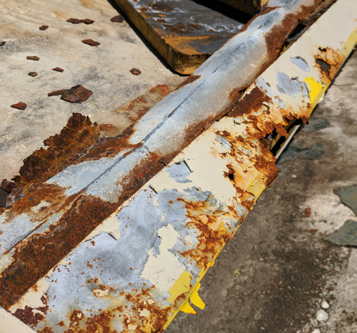 If finishes tear off, they can expose the building structure to the elements. Contact with water or salt in air can cause rebar to corrode and deteriorate. Inspect beams, columns and foundation for exposed rebar.