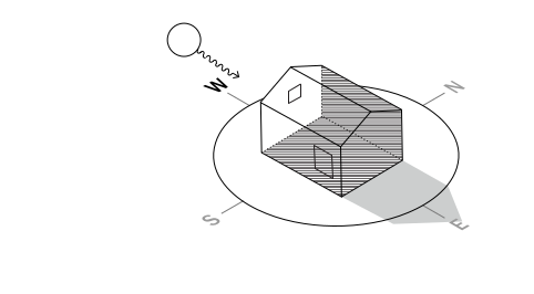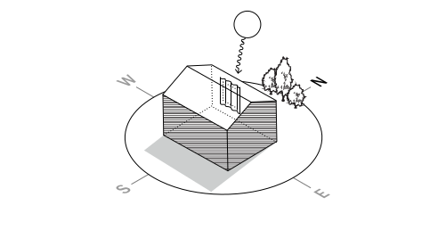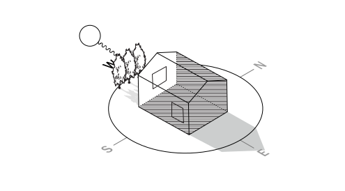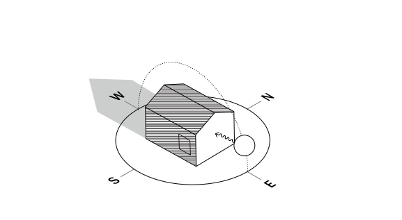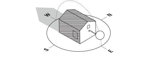 WEST Plant tall trees on the West side to reduce afternoon direct sunlight. |