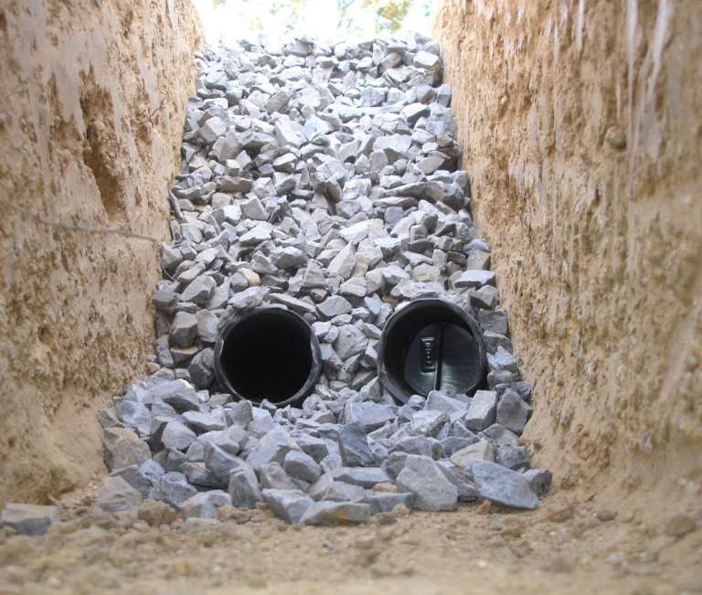 A French Drain system slowly drains surface water and can consist of a PVC tube with holes, different grades of rock or similar materials that allow percolation of water through the soil and out to a desired area.