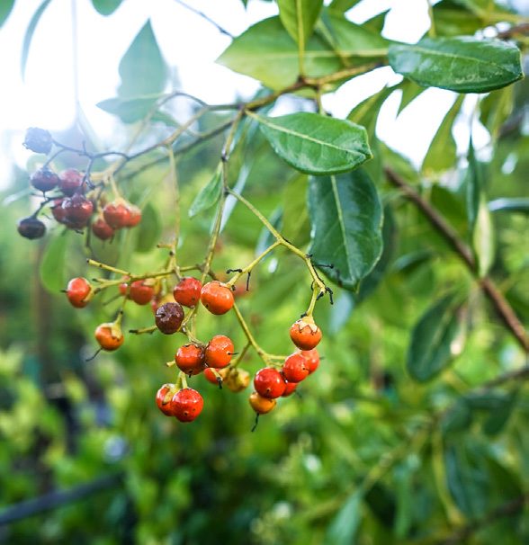 Small to medium tree with green leaves arranged alternately, and it has fruit that goes from orange to red when ripe.