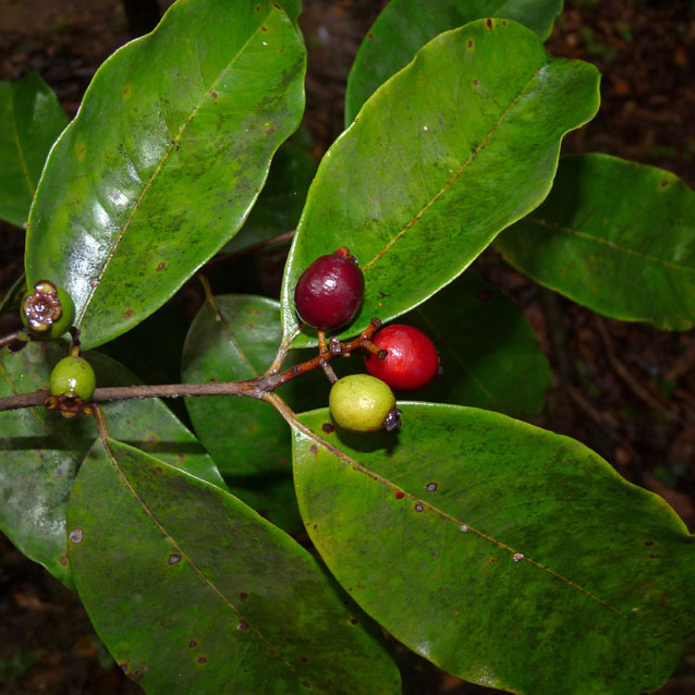 - Small to medium tree with green leaves and white small flowers. Gives small round fruit which is red when ripe.