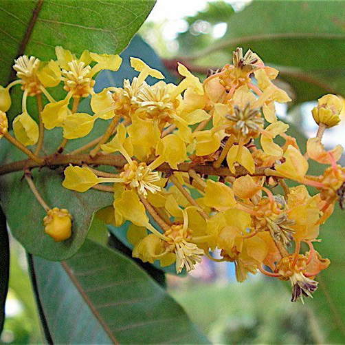 A medium tree with green leaves, though some are red, and others are yellow. The Maricao has yellow flowers and gives fruit irregularly through the year.