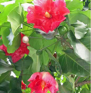 A small to medium tree with large green leaves and a red to dark red flower.