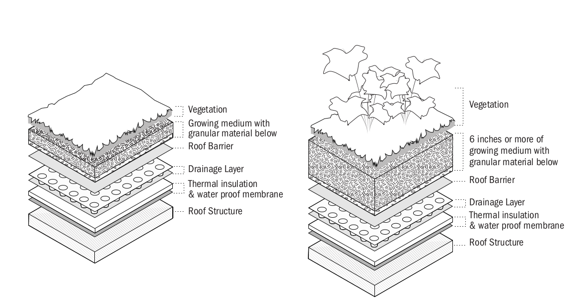 Roofs that are partially or completely covered with vegetation and a growing medium mitigate excessive heat gain and manage stormwater.- Green roofs are classified according to the depth of soil or growing medium, which determines species it can support.